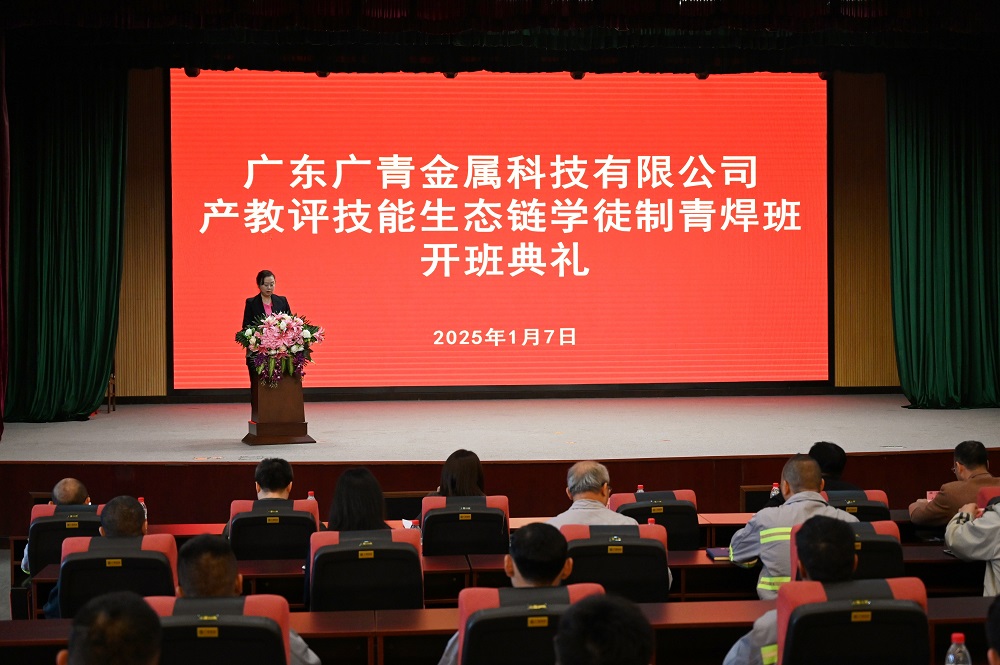 1月7日,由阳江市人力资源和社会保障局主办、广东广青金属科技有限公司与阳江市中乌巴顿职业培训学校联合举办的产教评技能生态链学徒制青焊班在公司四楼礼堂开班。市人力资源和社会保障局党组成员、副局长车代表,公司党委副书记、工会主席王大庆,中乌巴顿职业培训学校校长任香会,市、区人社局、链员企业有关负责人、企业导师及焊工班学员约40余人参加开班典礼。