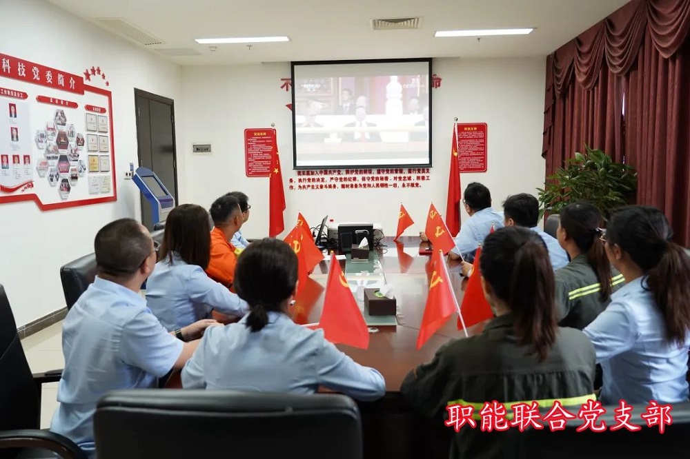 在办公楼一楼会议室的主会场,公司党委委员和其他领导班子成员,与综合部党支部全体党员一起,手持党旗,集中观看庆祝大会,共同见证建党100周年这一举世瞩目的历史时刻。党员、入党积极分子及职工代表在厂部、车间的6个分会场集中收看大会直播实况。