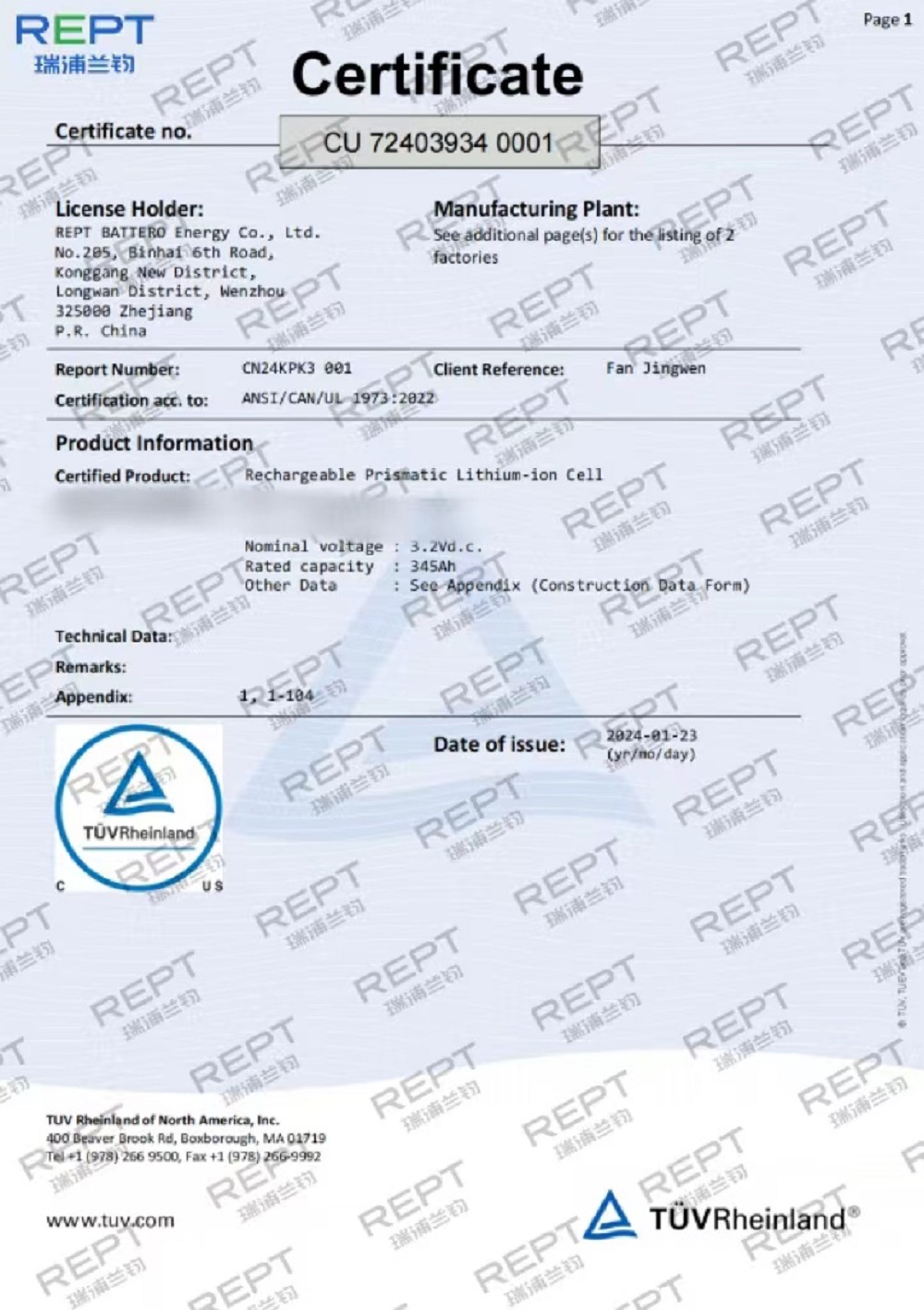 近日,瑞浦兰钧能源股份有限公司问顶345Ah储能电芯通过了德国莱茵TÜV Rheinland颁发的UL1973、UL9540A、IEC62619三项国际权威认证,同时通过了UN38.3认证,这标志着问顶345Ah储能电芯在安全性能上已经达到国际标准,并获得了通往国际市场的通行证。