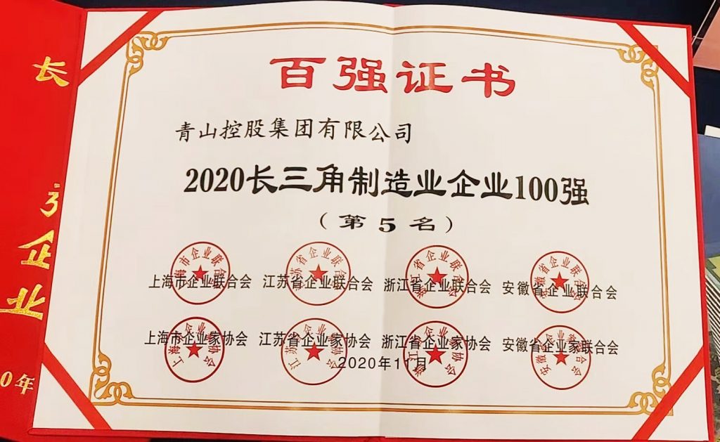On December 18, the 8th Member Representative Conference and “2020 Zhejiang Enterprise Leaders Summit” hosted by Zhejiang Enterprise Confederation, Zhejiang Entrepreneur Association, and Zhejiang Industrial Economic Federation were held in Hangzhou. A series of lists of 2020 Zhejiang Top 100 Enterprises, Top 100 Manufacturing Enterprises, and Top 100 Enterprises in the Yangtze River Delta were released at the meeting. Tsingshan Holding Group Co., Ltd. ranked 4th among the top 100 enterprises, and 2nd among the top 100 manufacturing enterprises in Zhejiang Province in 2020, 14th among the top 100 enterprises in the Yangtze River Delta and 5th among the top 100 manufacturing enterprises.